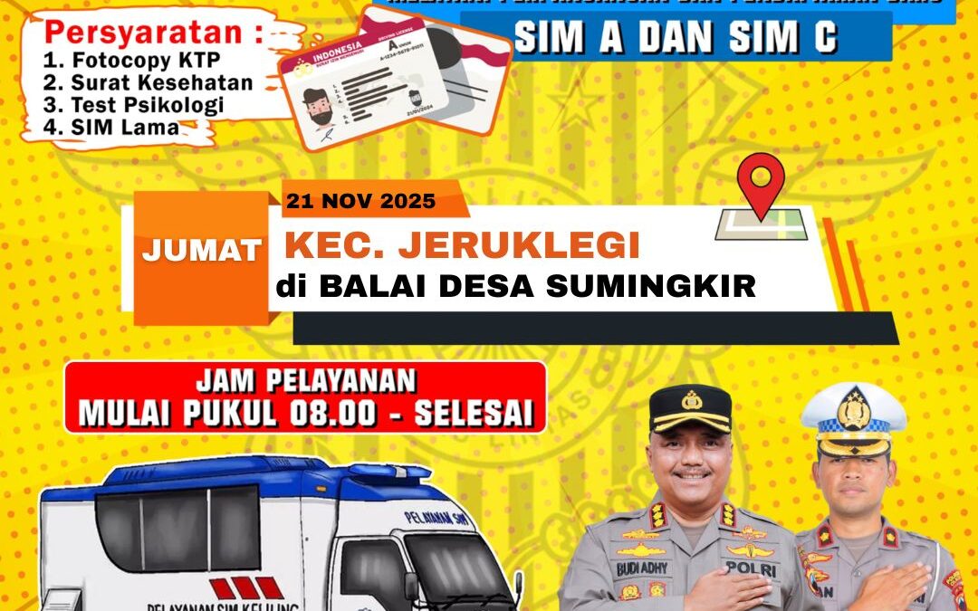 Sumingkir, 21 November 2025 — Satuan Lalu Lintas (Satlantas) Polresta Cilacap kembali menghadirkan layanan SIM Keliling untuk memudahkan masyarakat dalam melakukan perpanjangan dan pembuatan baru SIM A dan SIM C. Pada kesempatan ini, Desa Sumingkir, Kecamatan Jeruklegi, menjadi salah satu lokasi layanan dengan kegiatan dipusatkan di Balai Desa Sumingkir.